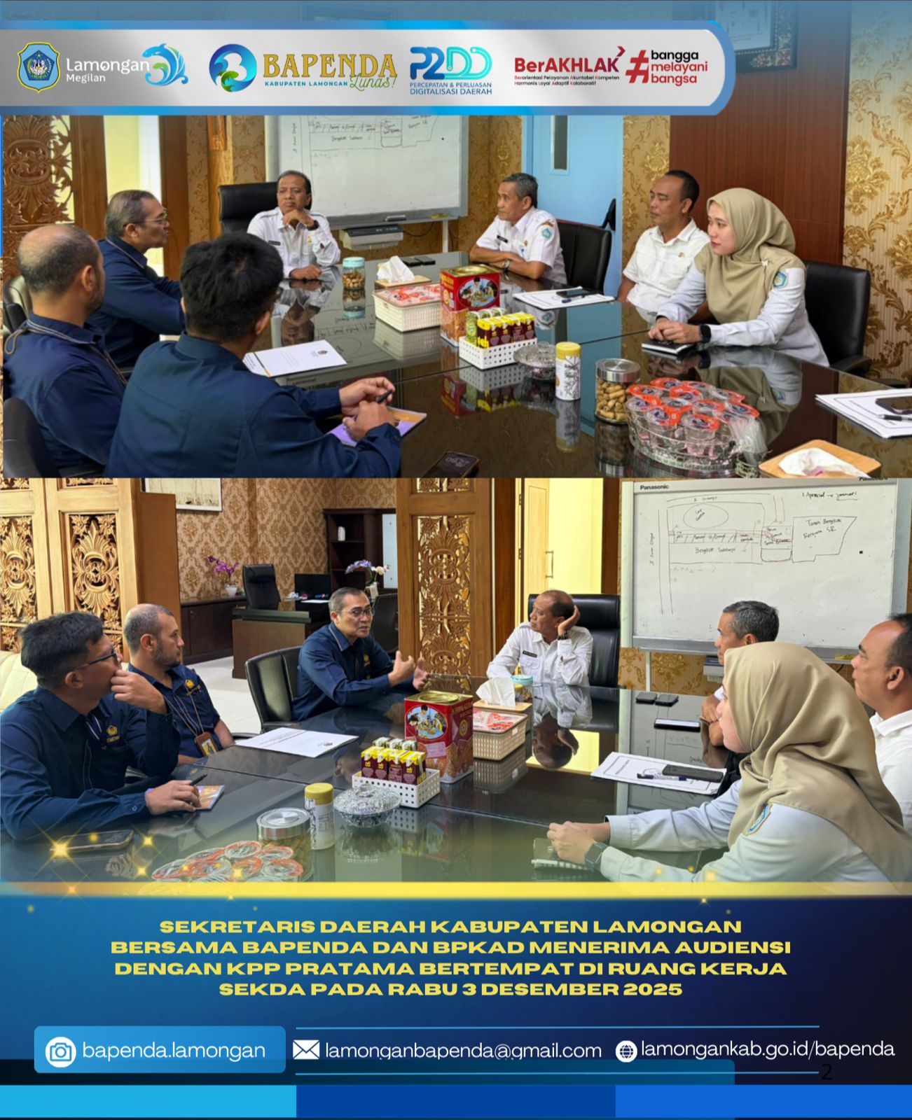 Sekretaris Daerah kabupaten Lamongan bersama Bapenda dan BPKAD menerima audiensi dengan KPP Pratama bertempat di ruang kerja Sekda pada Rabu 3 Desember 2025